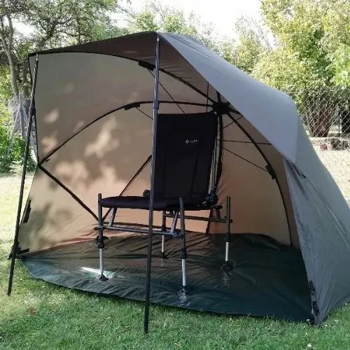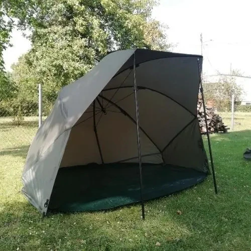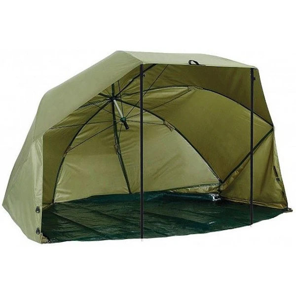 The original Daiwa Mission Overnighter, offering exceptional value and quality for the specialist angler at a very reasonable price point. Based around brolly shape with extended sides and a Velcro attachable groundsheet. The canopy is made from extra durable PU coated nylon and features taped seams. Two storm rods are supplied for fitting to the front of the canopy as shown. Second storm caps are located at the sides for the application of shorter storm rods of the users choice. An overwrap that converts the shelter into a mini bivvy with a roll-up zip up door is available to buy separately.Â